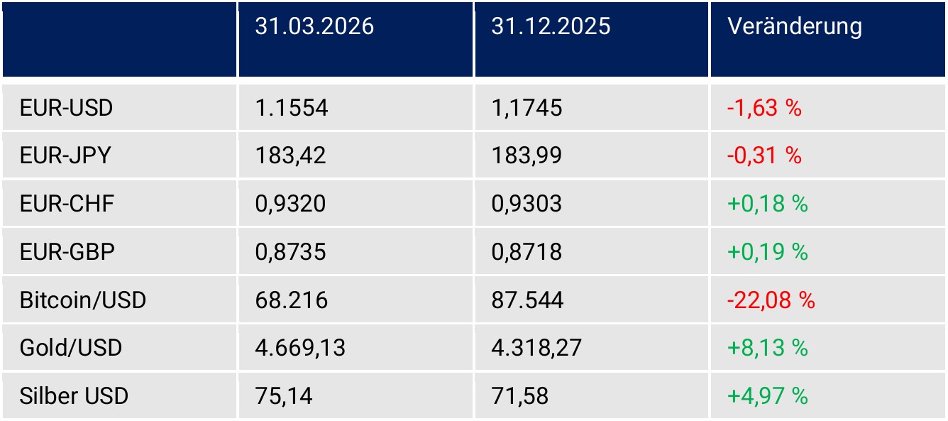Der sogenannte „Safe Haven“ Reflex, in Krisenzeiten Sicherheit im USD zu suchen, fiel im historischen Kontext bezüglich des Irankriegs widerwillig und unterproportional aus. Ein Erklärungsansatz bietet die erodierende Akzeptanz des USD wegen des Risikos von Sanktionsregimen und der „Gutsherrenart“ und Unberechenbarkeit der US-Außenpolitik.     Gegenüber dem JPY, CHF und GBP waren die Veränderungen des EUR im Quartalsvergleich mit deutlich unter 1 % eher kosmetischer Natur.